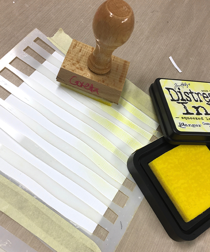 Per prima cosa ho creato lo sfondo a strisce con l’aiuto dello stencil, semplicemente sfumando con Distress Squeezed Lemonade,