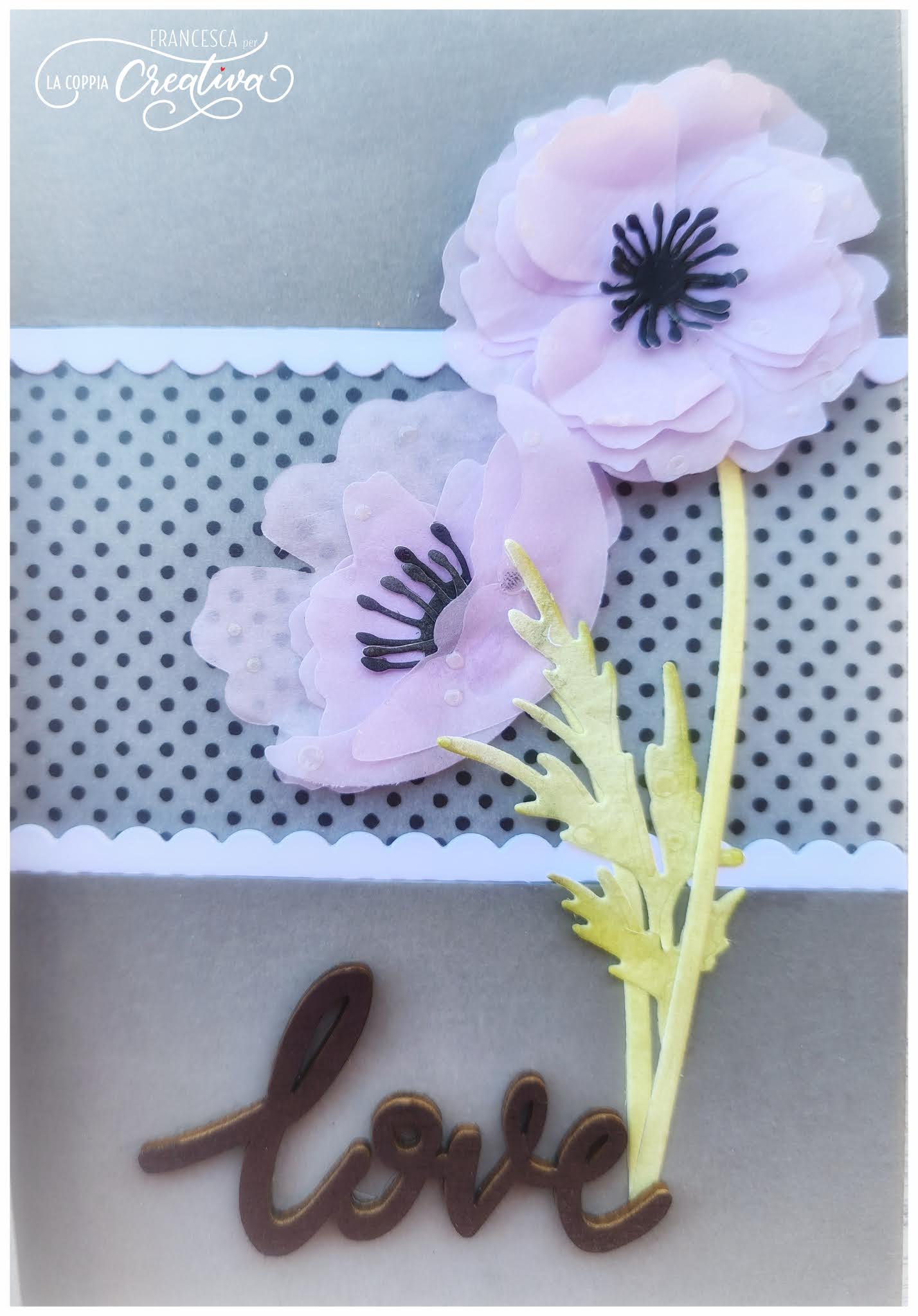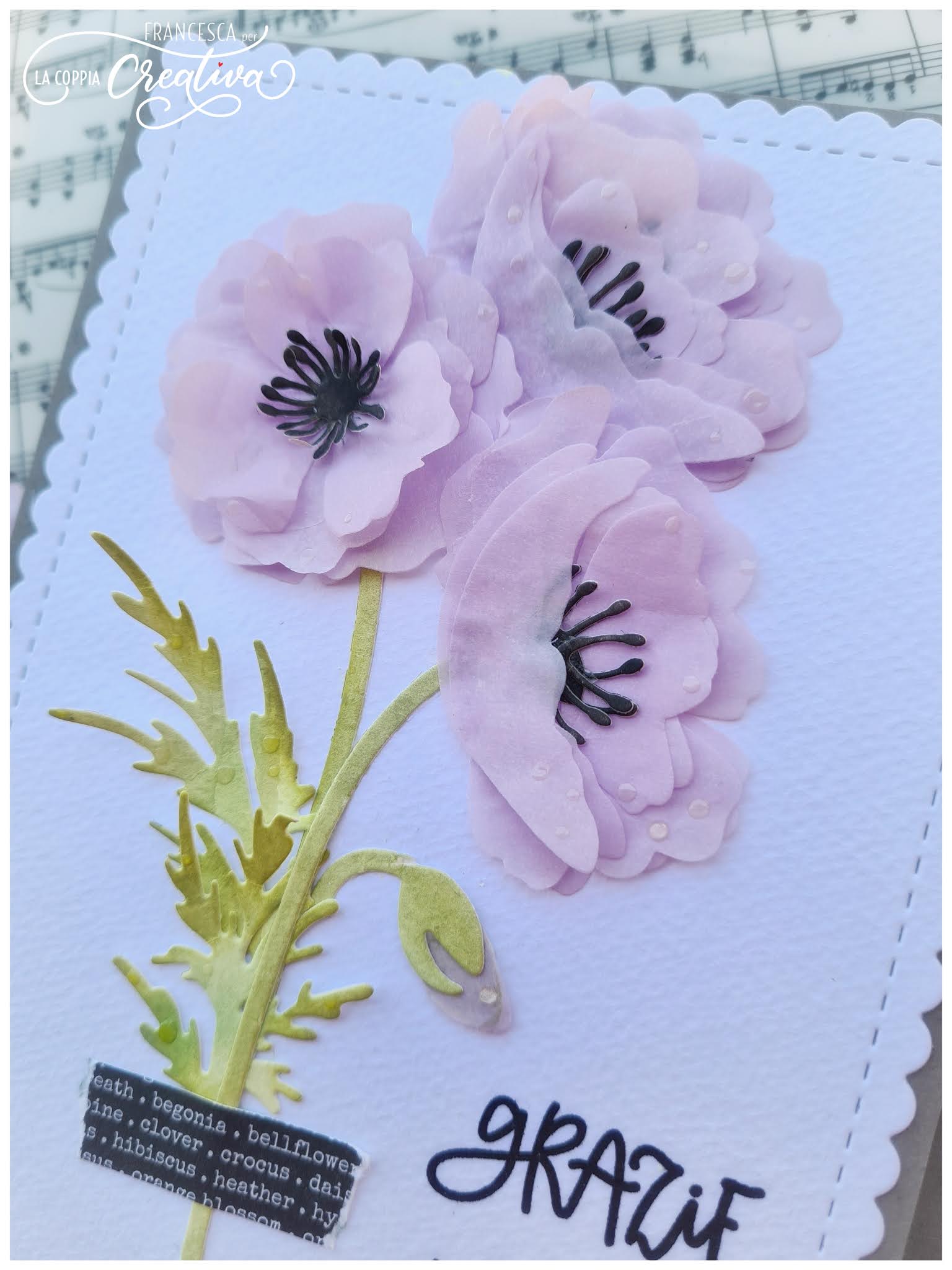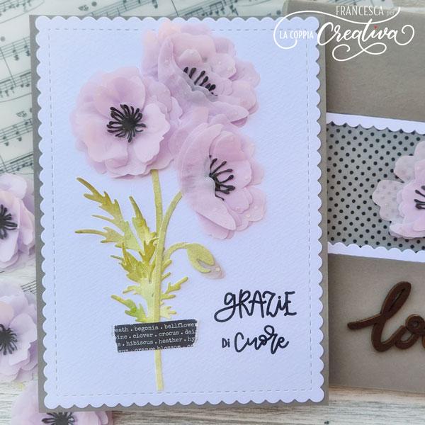 Il mio progetto di oggi è una card con busta coordinata, realizzate entrambe con i magnifici papaveri della nuova collezione, i cui petali sono stati fustellati su carta velina color lilla.