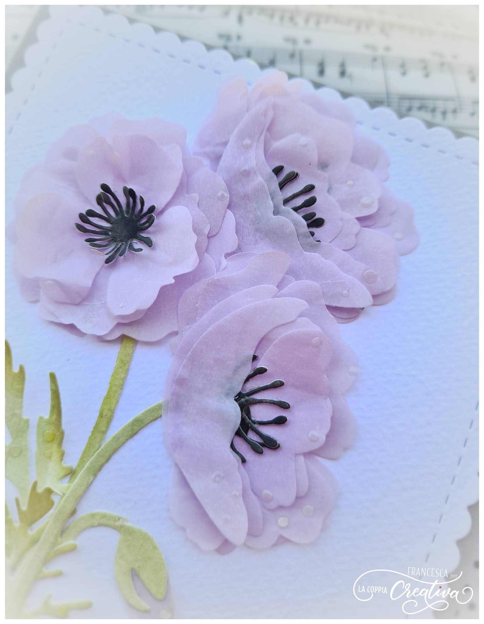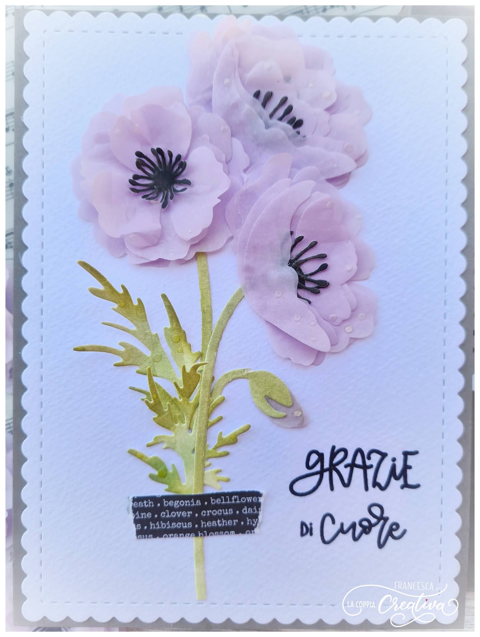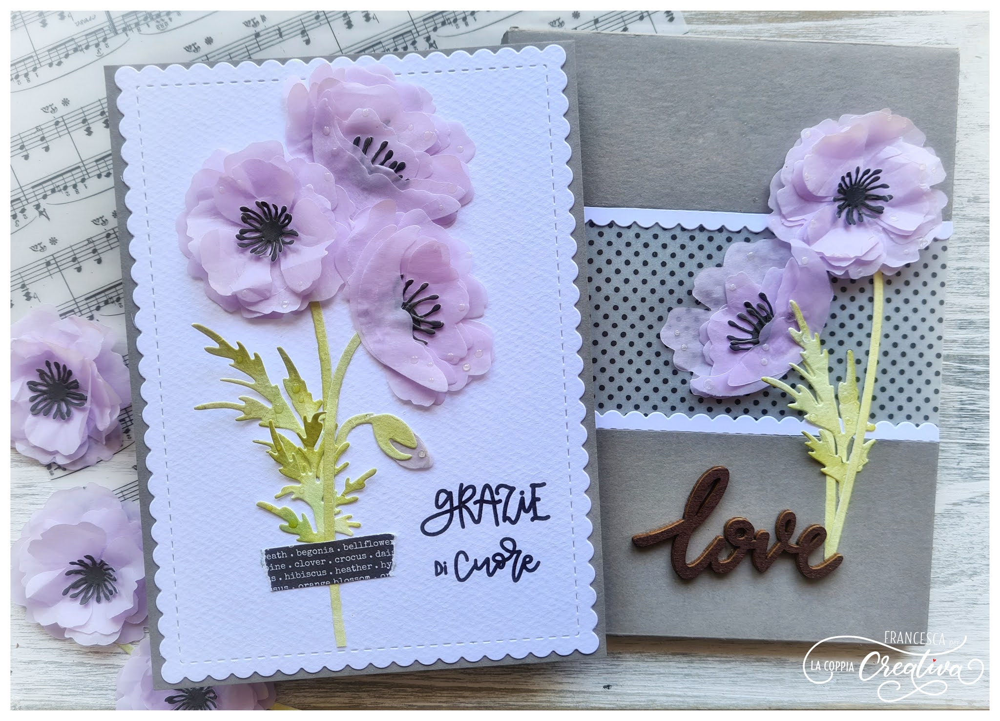 Il mio progetto di oggi è una card con busta coordinata, realizzate entrambe con i magnifici papaveri della nuova collezione, i cui petali sono stati fustellati su carta velina color lilla.