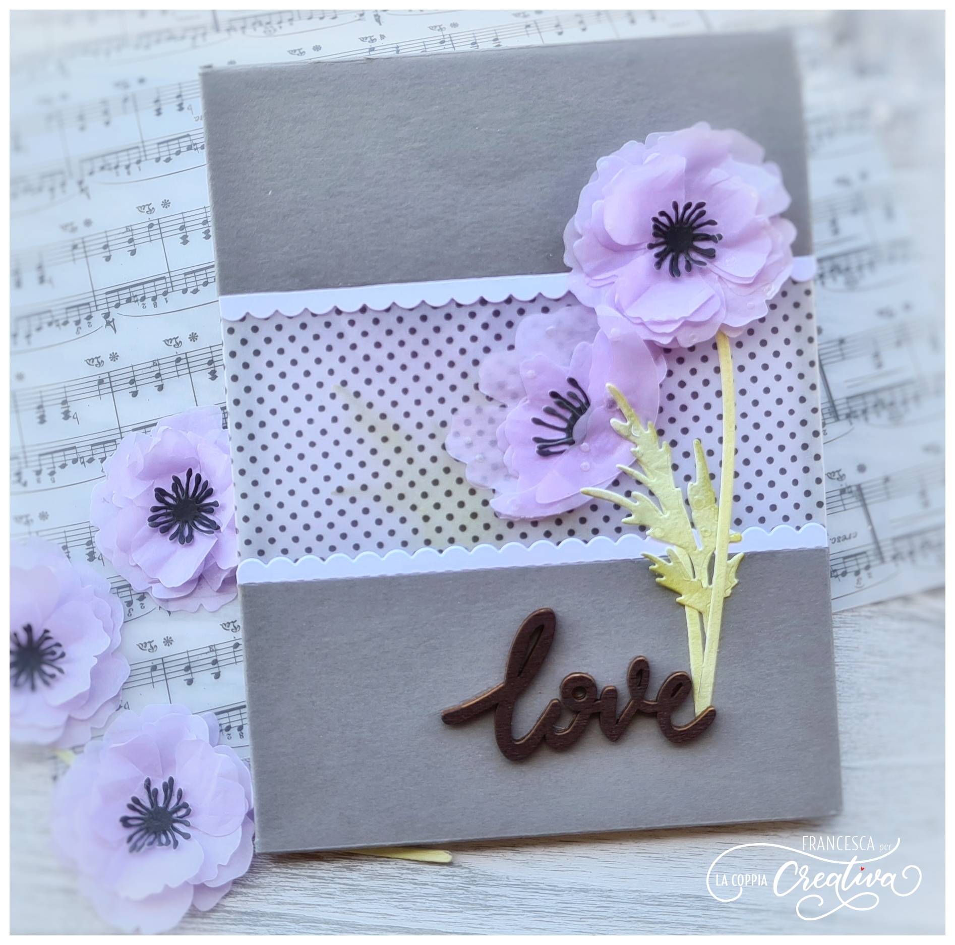 Per questo progetto ho scelto dei colori inusuali per me, ma trovo che l’accostamento del grigio e del lilla sia molto armonioso, soprattutto se alternato alla leggerezza ed alla trasparenza del vellum.