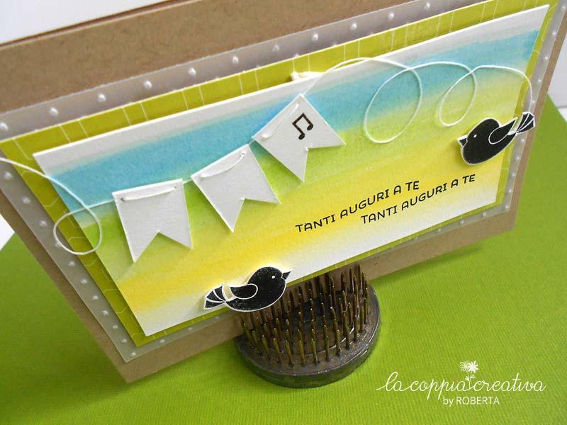 Intorno alla scritta due uccellini che ho timbrato su cartoncino bianco, ritagliato ed incollati con del biadesivo spessorato. Completano la decorazione il filo bianco con tre bandierine.