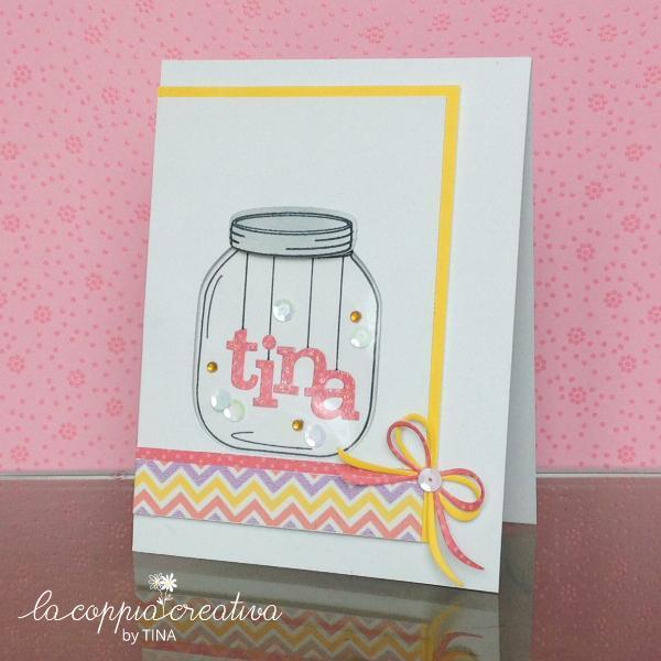 Questa volta ho riempito il barattolino `di vetro` con il suo nome. Avevo fretta di spedire la card e non avevo tempo per fare tante foto…cosi l`effetto vetro non si vede bene…