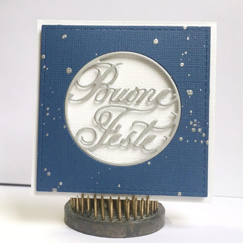Ho tagliato, con la stessa fustella, la scritta nel cartoncino argento, e l’ho “incastrata” al centro del cartoncino blu.