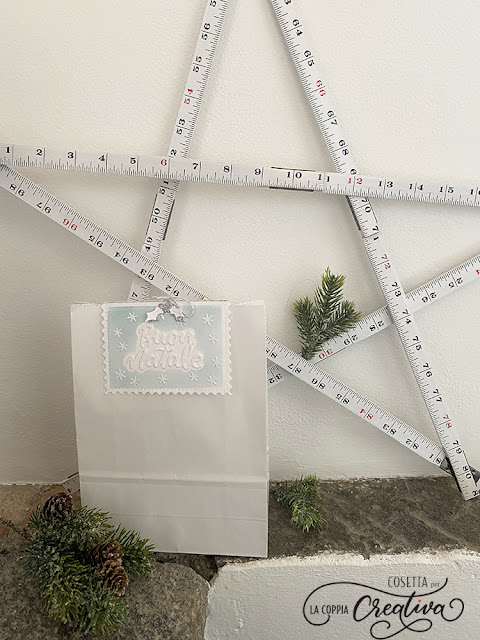 Ho fustellato le stelline (applicate ai bordi della card) e la scritta Buon Natale con il set fustelle “Buon Natale con addobbo“.