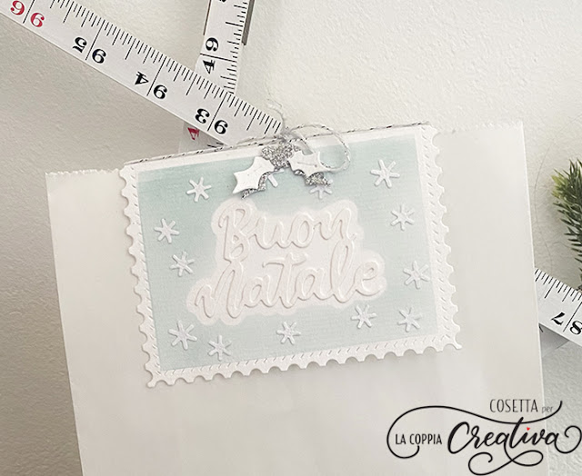 Nella parte superiore troviamo tantissime piccole stelline d’argento, tre alberelli innevati (è una delle fustelline omaggio che potete ricevere quando acquistate i prodotti de La Coppia Creativa!) e una piccola casetta con il tetto innevato ed un cuoricino (anche questa una delle fustelline omaggio per l’acquisto dei prodotti).