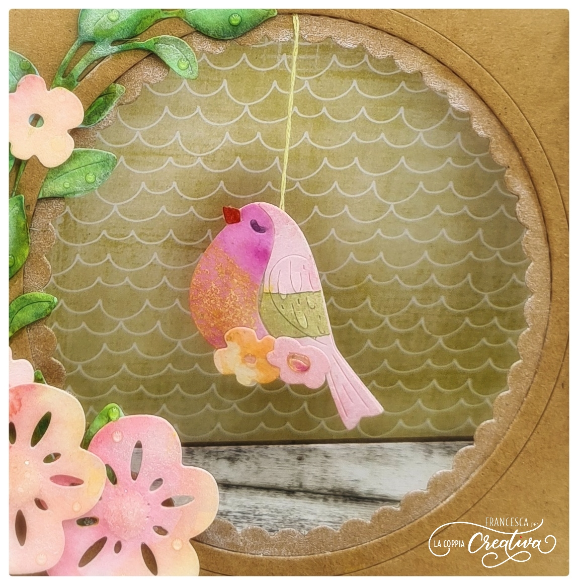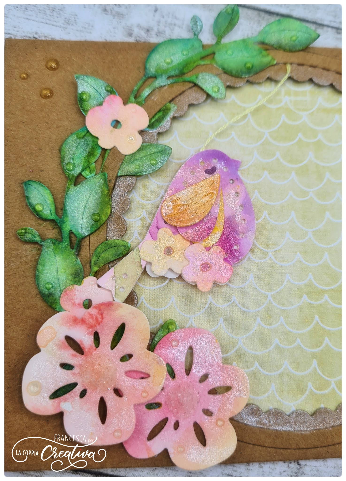 Ho poi assemblato la casetta degli uccellini del set Gioie di Primavera, mantenendo gli stessi colori delle foglie; ho timbrato e fustellato uno dei sentiment del set Sei nel mio cuore.