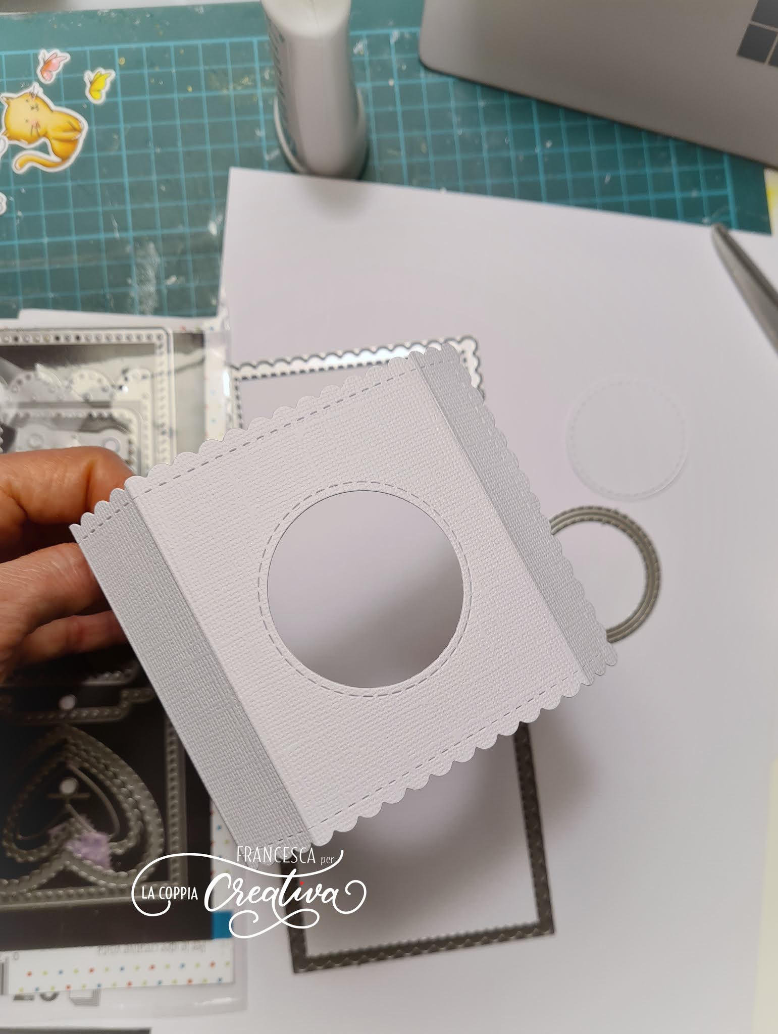 Per realizzare la mia card ho utilizzato il set di fustelle Cerchi creativi su una base bianca, giocando con gli spessori per dare movimento alla card.
