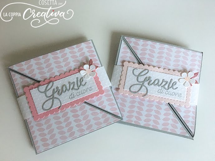 Non ho ancora finito le bomboniere, ma ho già preparato i ringraziamenti. Ho scelto una struttura chiamata “trifold card”, chiusa con una fascetta (anche di questa card trovate lo schema in fondo al post).