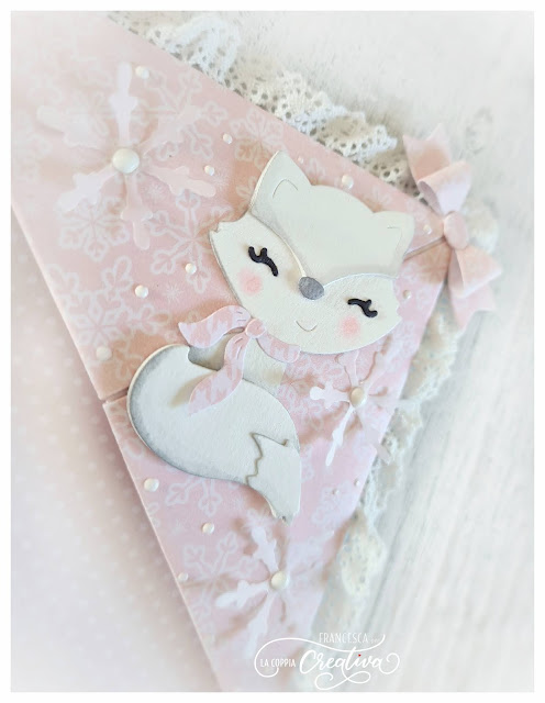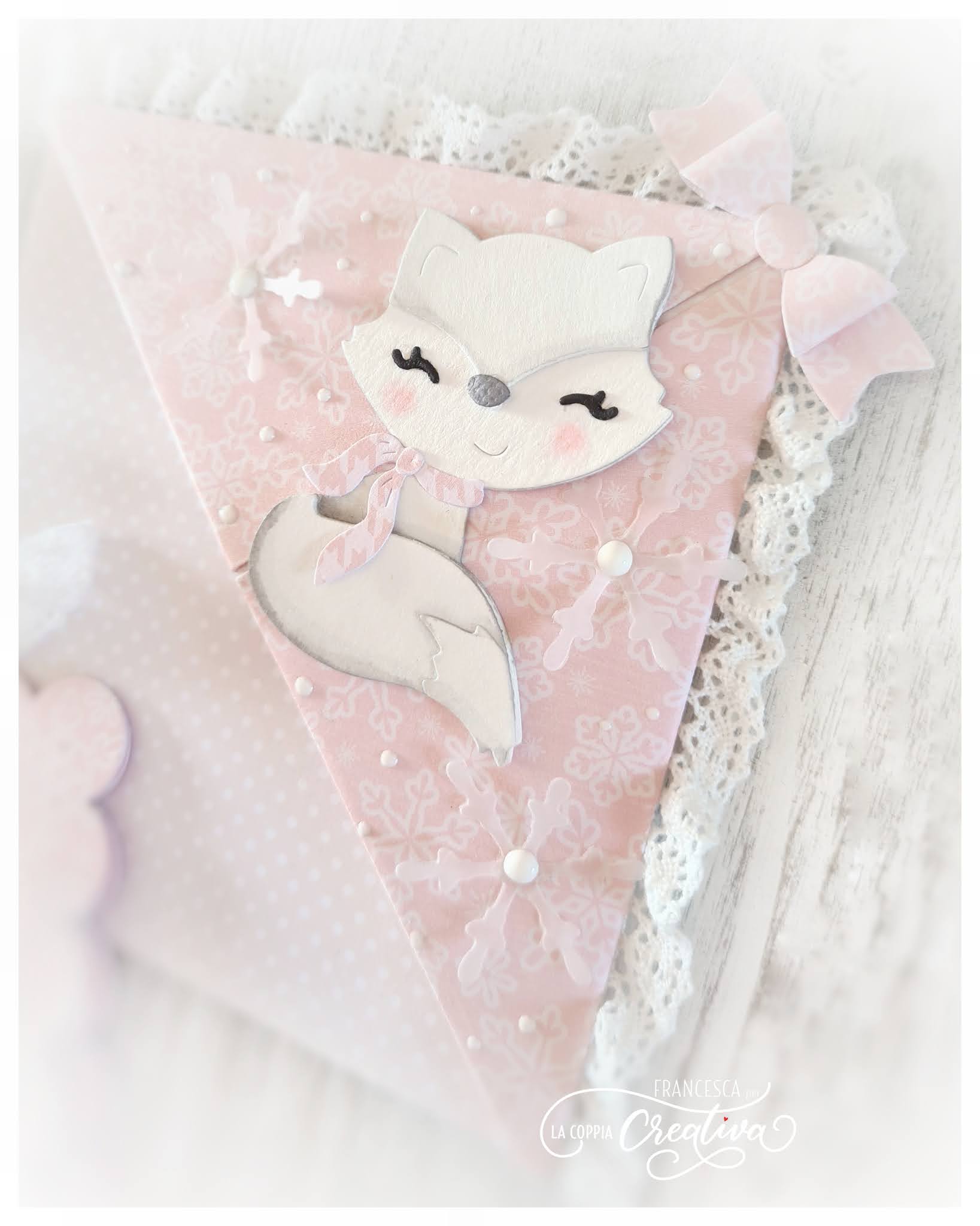 Utilizzando la fustella “Colline e valli”, ho creato una piccola collina utilizzando del cartoncino glitterato bianco, sopra il quale ho aggiunto un cuoricino rosso.