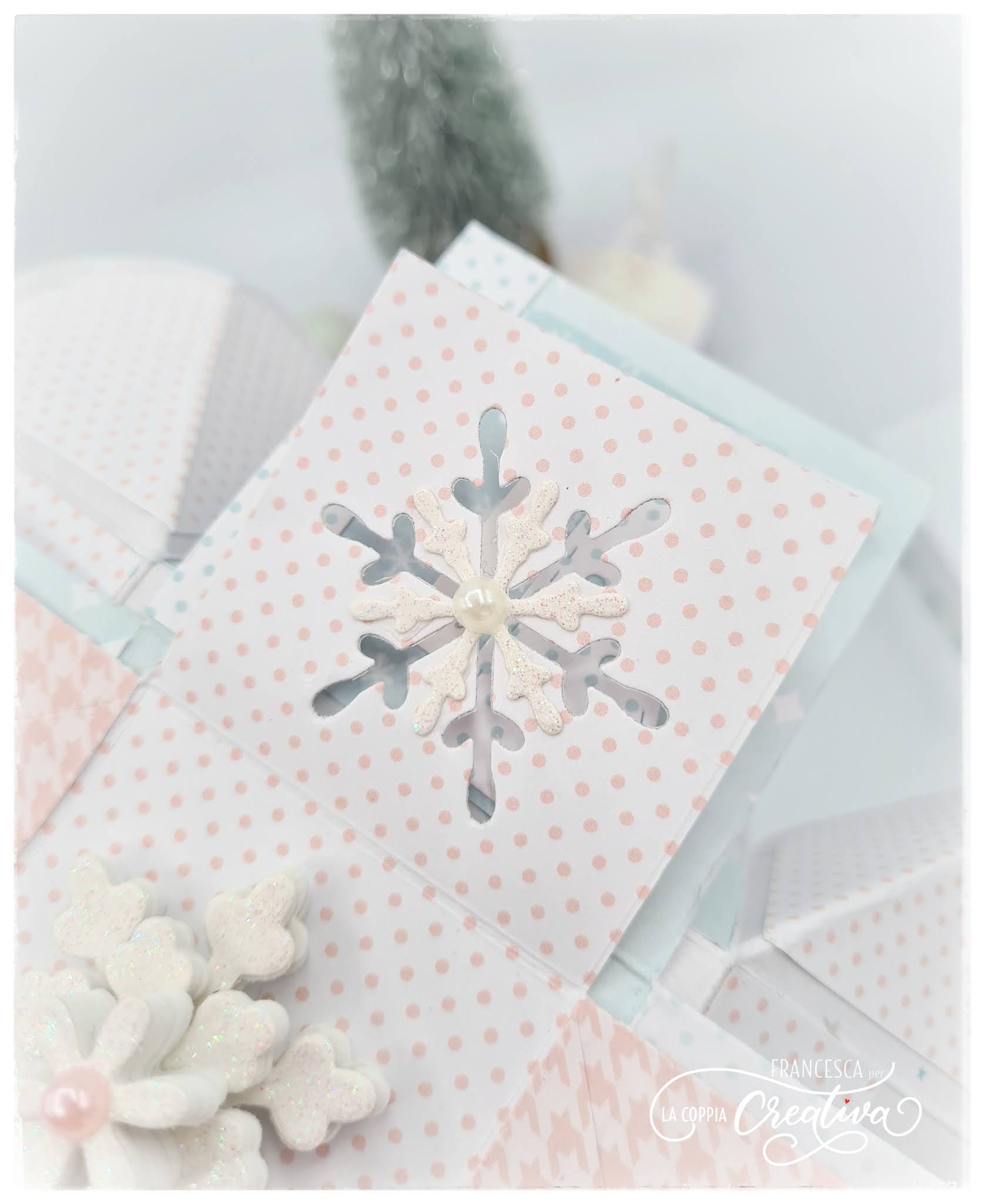scuro solo sull’esterno. Con il Versamark ho timbrato in alto i fiocchetti di neve che ho poi embossato con la polverina bianca. Ho infine aggiunto il fiocchetto rosso del set “Slimline 2”.