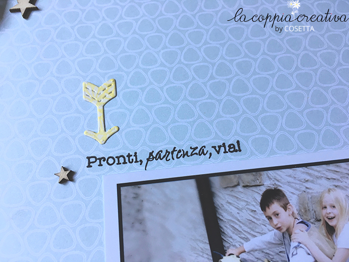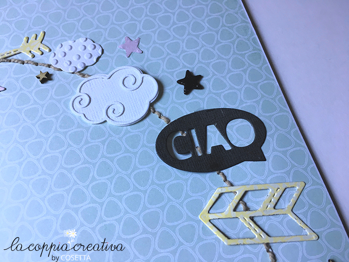 Per questa pagina sono partita dal cerchio ricamato con uno filo di lino. Tutt’intorno ho incollato un po’ di nuvolette, frecce, stelline, una girandola ottenuta dal quadrato cucito, una fustellata Ciao, Scritta, sentments e piume…