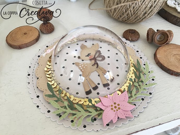 Per il decoro centrale ho ricavato un cerchio impunturato (set “Cerchi cuciti”) da del cartoncino per acquerelli; ho creato il cielo con il Distress Oxide. Per la neve ho usato la fustella nuvole contenuta nel set “Luna e stelle” (cartoncino acquerellabile, ma solo per avere la stessa tonalita’ di bianco! e carta grigia a stelline). Ho poi fustellato la rennina, sempre nel cartoncino acquerellabile, e ho fatto lievi sfumature in grigio (distress oxide); ho aggiunto la sciarpina in grigio e stelline. Ho incollato la neve, la renna e ho completato con tre alberelli (set “Villaggio felice”) e la scritta “Buone Feste” (fustelle “Buone Feste sul filo”).