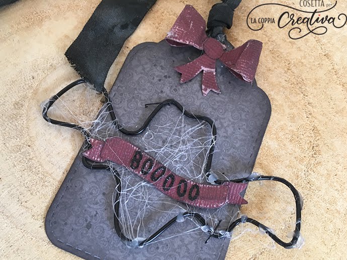 Ho creato una tag tutta nera, colorando i bordi con distress Black Soot, ho “distressato” anche la bandierina e il fiocco, stropicciandoli un po’ e passando una lima per dare un tocco di “rovinato”, infine ho sporcato i bordi di nero….
