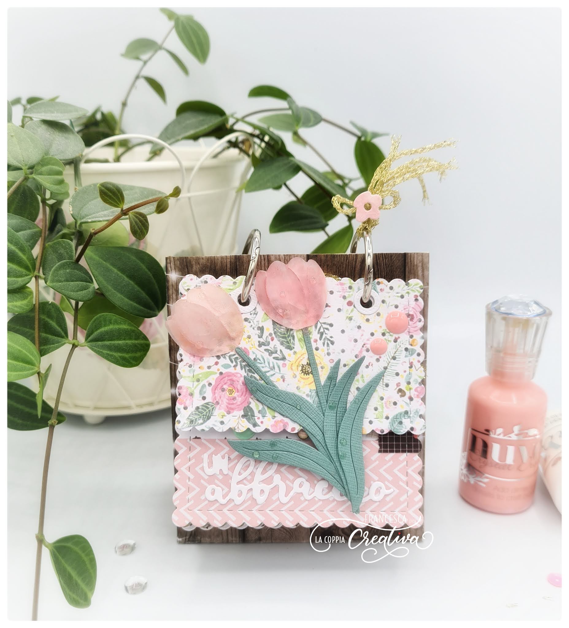 Per la “copertina” ho scelto i delicatissimi tulipani, fustellati in parte su cartoncino Bazzil (gambo e foglie) ed in parte su vellum acquerellato (petali).