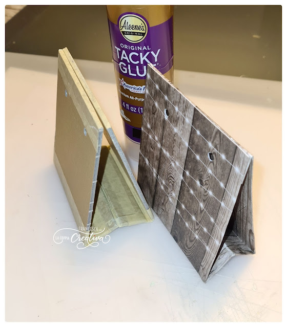 … ho ricoperto la struttura con della carta patterned, lasciando, nella parte superiore, una linguetta di carta aggiuntiva che, piegata su sé stessa ed incollata all’altro lato della struttura, la terrà saldamente unita.