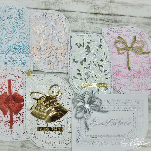 Mi ha così conquistata che ho voluto darle diverse interpretazioni, giocando con i colori dei fogli per foil ed anche con le strutture che mi ha regalato il set di fustelle ‘ Rettangoli chic ‘ (questo set è assolutamente un must have!!!).