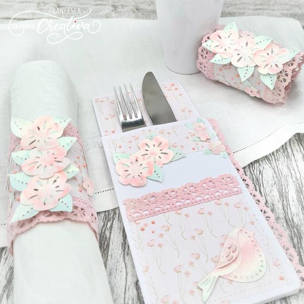 Ho decorato i porta posate fustellando la carta patterned con la fustella Slimline cards, che ho tagliato in più parti. Ho incollato i fiori, le foglie ed ho aggiunto anche il graziosissimo uccellino del set Uccellini, sempre colorato su carta acquerello.