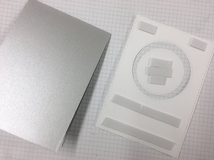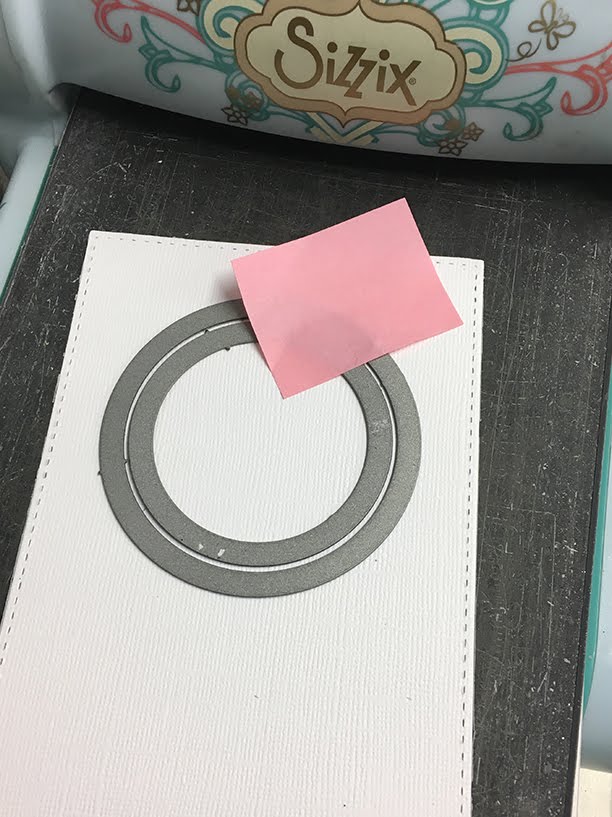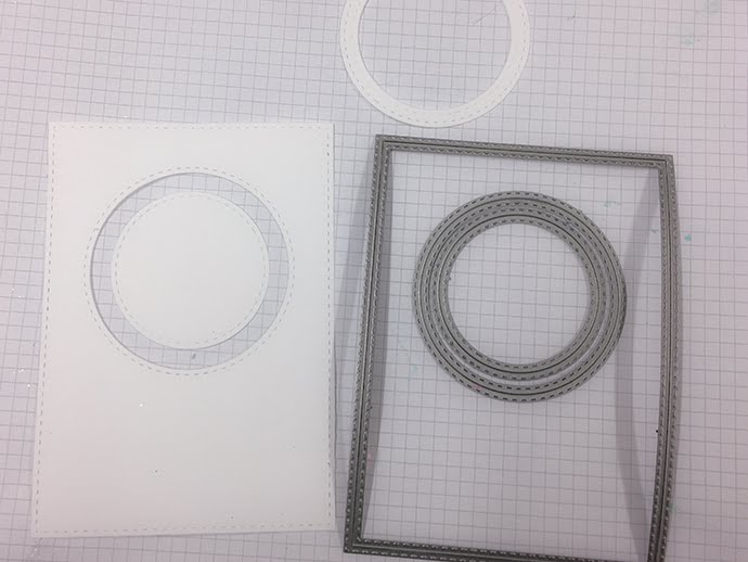 Per prima cosa ho fustellato due cerchi al centro del cartoncino (ottenuto con la misura più grande dei rettangoli cuciti)