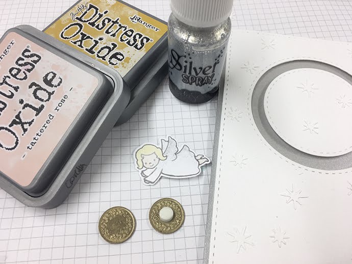 e l’ho colorato con i distress oxide. colori Fossilized Amber per i capelli e Tattered Rose per il viso, per il vestito dell’angelo invece ho usato un po’ di argento liquido di ModaScrap.
