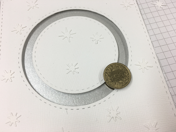 Ho usato una monetina da 5 ct (o 1 ct di €) che va inserita all’interno del binario, ho applicato un cerchietto di biadesivo spessorato al centro della monetina