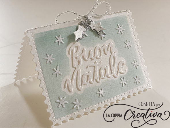 Con la fustella “punto croce” ho creato il fondo del biglietto dove poi ho incollato la tazzina e il banner con la scritta “Buon Natale”.