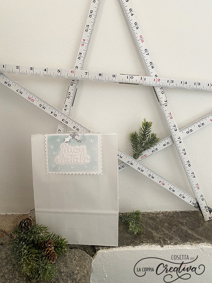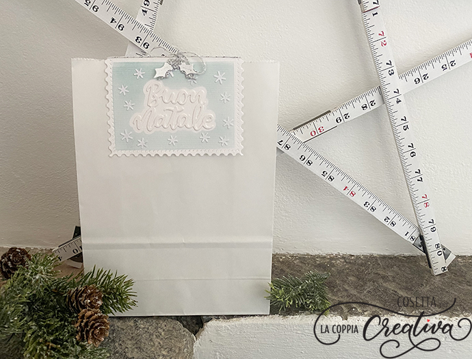 Il fronte del chiudipacco l’ho decorato con gli stessi elementi che ho utilizzato nel biglietto. Ho fatto passare un twine rosso e bianco all’interno della piega e l’ho annodato esternamente.