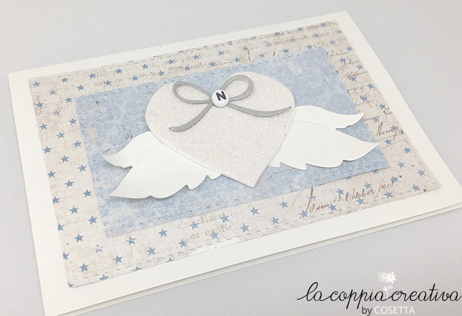 Per l’interno ho fustellato tono su tono la scritta “Benvenuto piccolino” e tante stelline incollate qua e la…