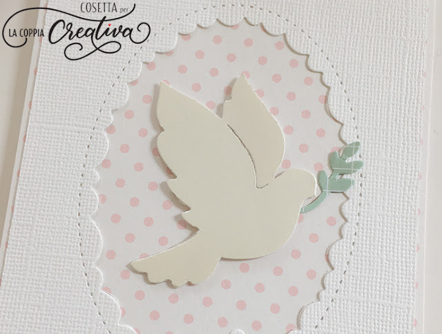 Per questa card ho scelto il tono su tono, la scritta bianca su fondo bianco, la colomba perlata e un piccolo tocco di rosa, perché mi sembrava più delicato, cosa ne dite?