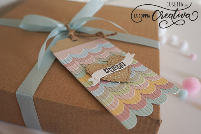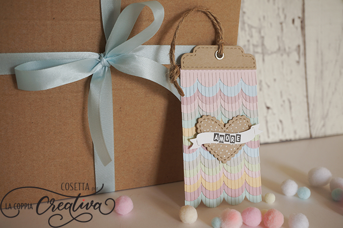 Ho fustellato la tag nel cartoncino kraft e nei colori pastello i due elementi che trovate nel set di fustelle, bordo smerlato a frangetta e tab superiore.