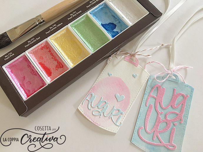 Pur non essendo tanto brava con gli acquarelli, per queste tag ho voluto giocare con i pennelli e devo dire che mi sono divertita tantissimo… Ho creato delle macchie sulle tag, anche le scritte sono fustellate dalla carta acquarello precedentemente colorata con i bellissimi colori della Kuretake, che lasciano un leggero effetto glitter/perlato.