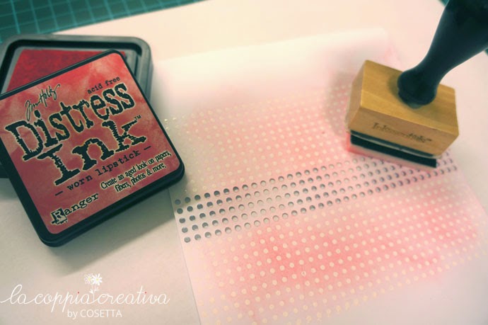 Per sfumare ho usato i Distress e visto che il rosa è il mio colore, ho scelto la tinta Worn Lipstick. Ho sfumato tutto e poi ho fustellato un cerchio, abbastanza grande da incollare al centro del mio centrino doily… Infine, sotto il centrino ho messo una striscia di un rosa più scuro, in modo da far risaltare i buchini…