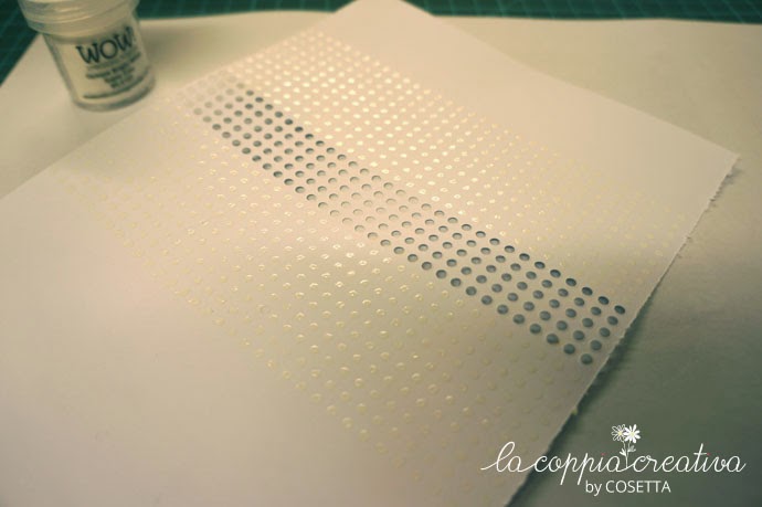 Prima ho tagliato una striscia di puntini, poi ho timbrato e embossato a caldo con polverina bianca.