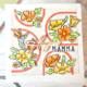 La card è quadrata; ho tagliato un semicerchio lateralmente, lungo la circonferenza ho creato una ghirlanda di spighe, alternando i colori ed inserendo qualche spiga in vellum, sulla ghirlanda si è posata una colomba; al centro ho messo un cerchio più piccolo su vellum, decorato con i simboli della Prima Comunione. Due piccole tags con nome e data