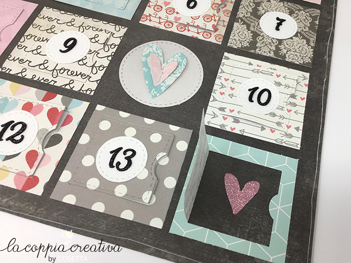 Le finestrelle sono incollate su una base nera effetto lavagna, che ho poi rinforzato con un cartoncino. Ho ritagliato 14 quadratini misura 6.5 x 6.5 cm, e fustellato al centro la finestrella con “quadrati romantici”, ottenendo una porticina… Non c’è sicuramente bisogno di spiegarvi come fare i cerchietti con i numeri… e… le carte sono della collezione Head over Heels della Echo Park.