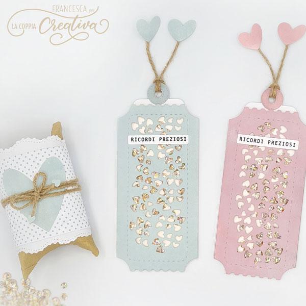 Nella parte superiore della tag ho aggiunto il tab del set Card a Cascata, che ho decorato con spago e cuoricini.