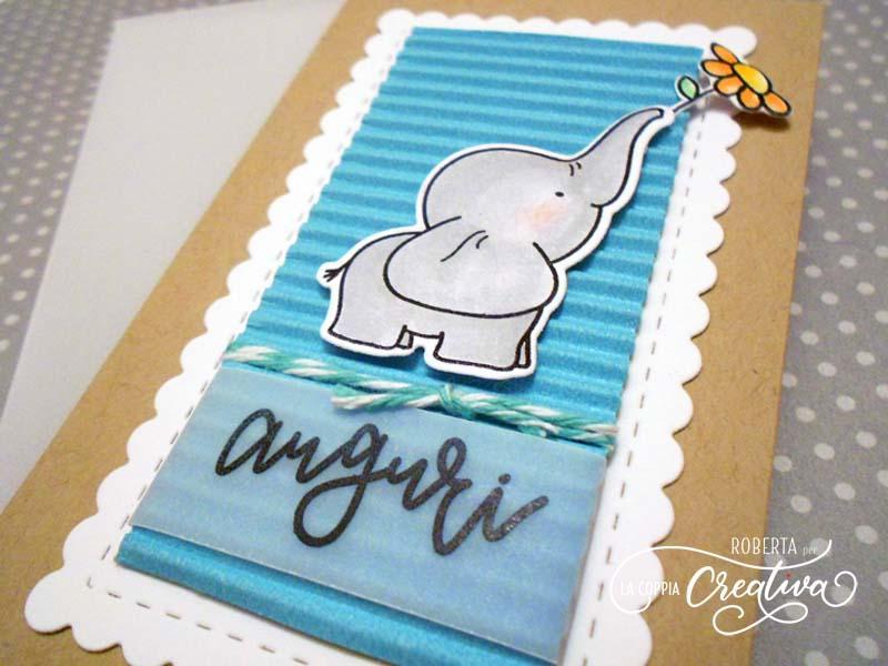 Sono partita colorando, dopo aver timbrato, l’elefantino ed il fiore ed ho costruito la dimensione della card rispetto a questi due elementi. La base della mini card è in cartoncino kraft e misura 7,5×11,5 cm. Alla base ho incollato un rettangolo smerlato in cartoncino bianco e su questa un rettangolo di cartoncino millerighe turchese che ho decorato con una fascetta di vellum, dove ho timbrato la scritta auguri, un twine turchese e bianco e i due timbri colorati.
