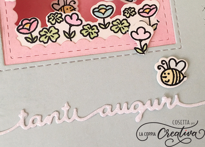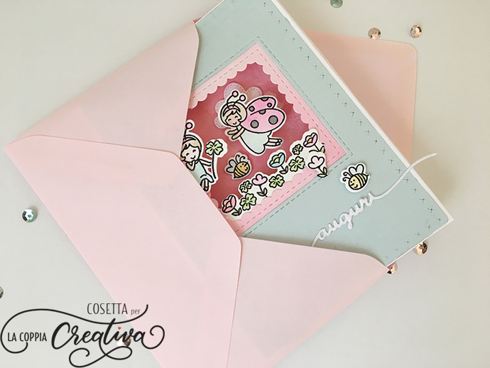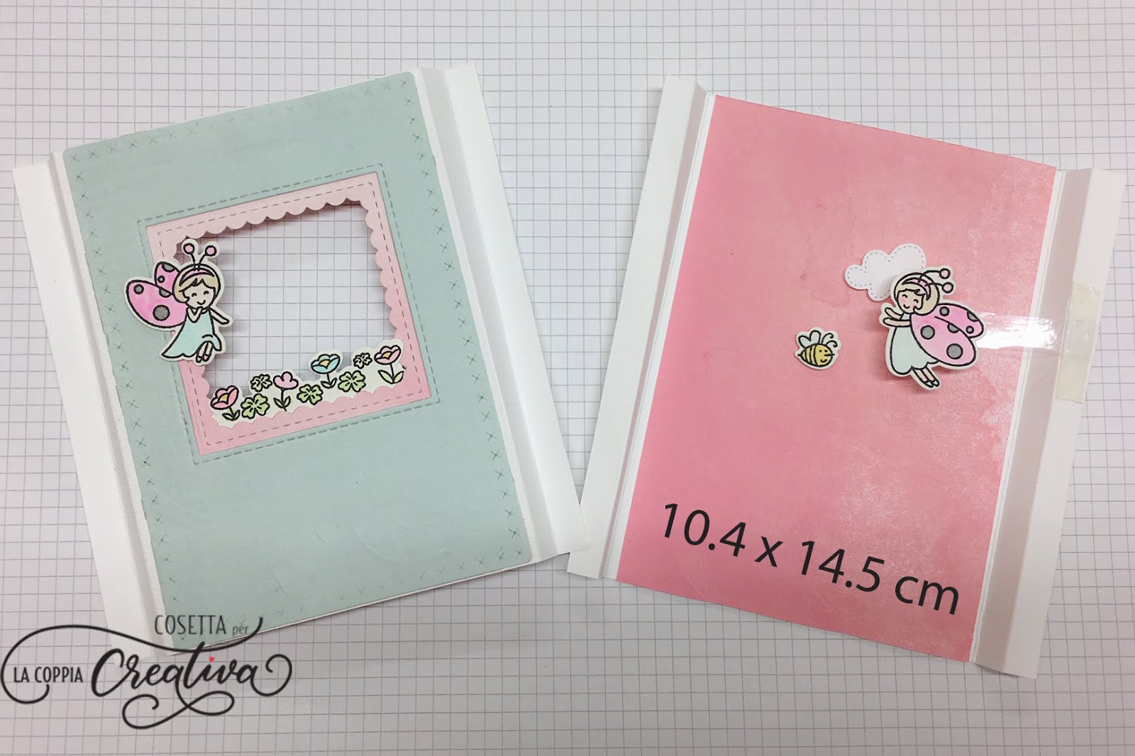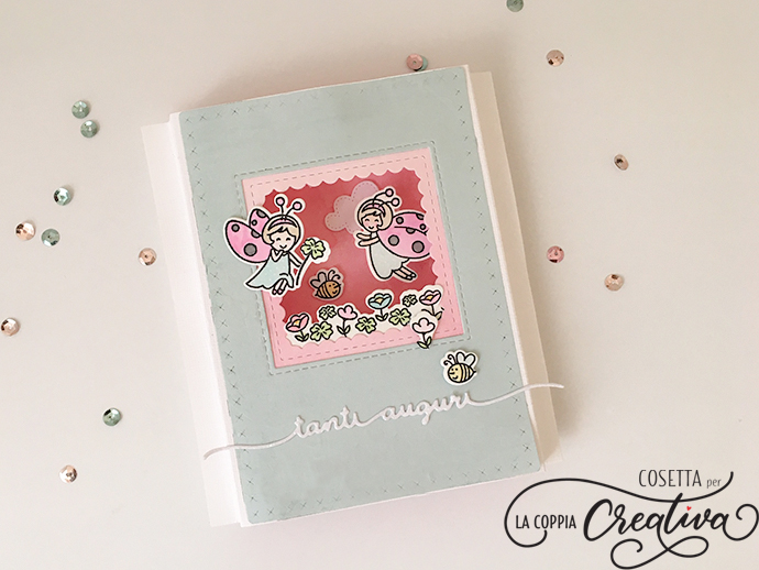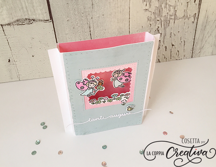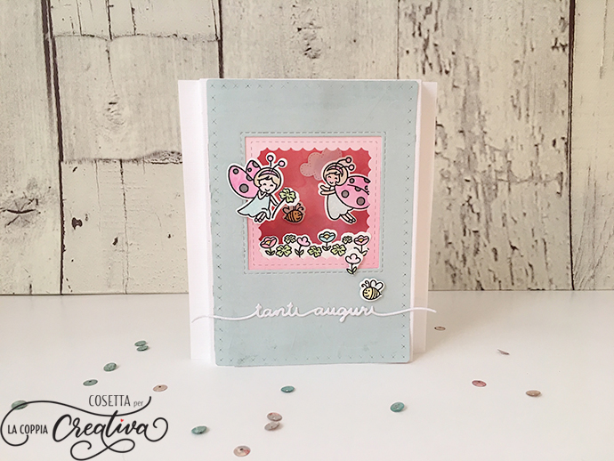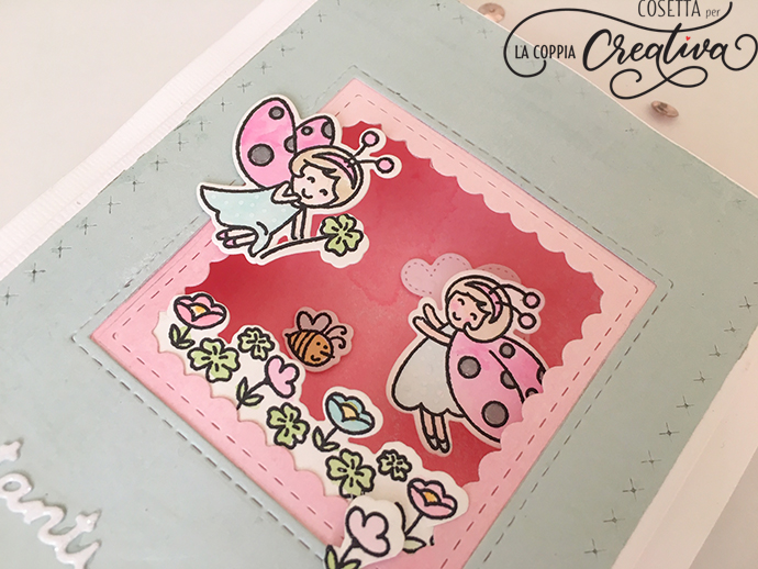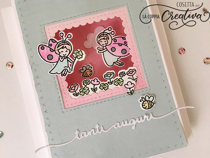 Prima di incollare le due parti della card le ho decorate, il trucco è quello di incollare una coccinella tra le due pareti della card, così sembrerà in volo…