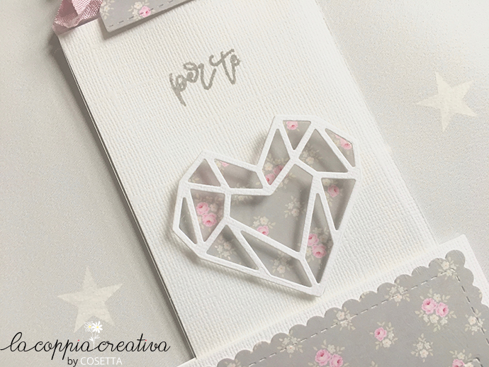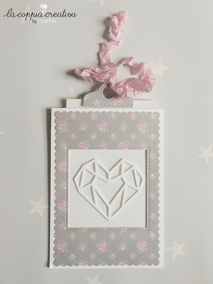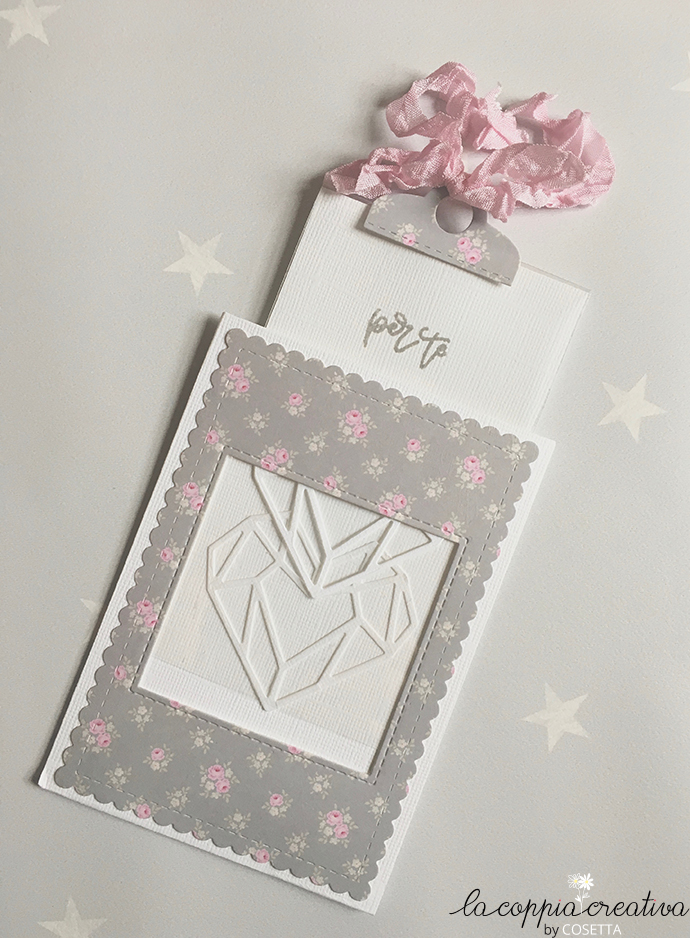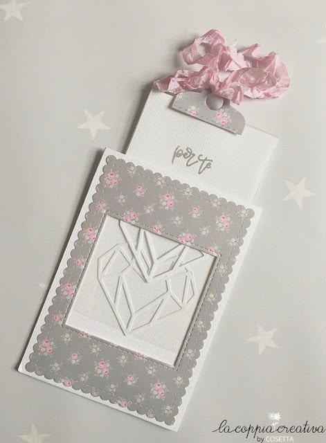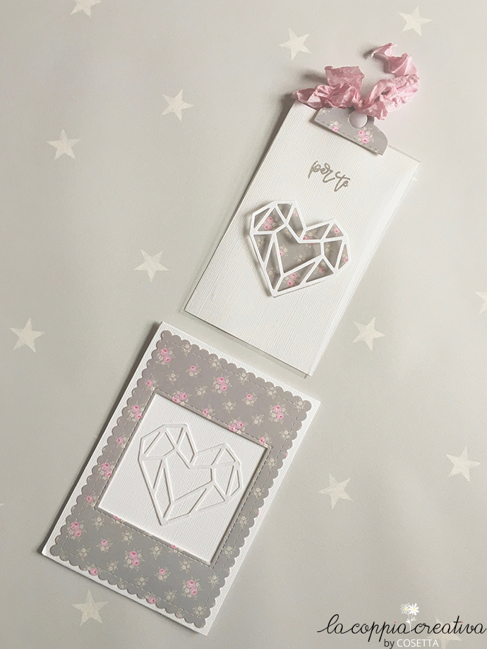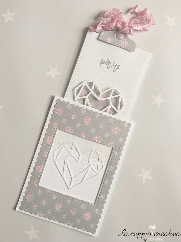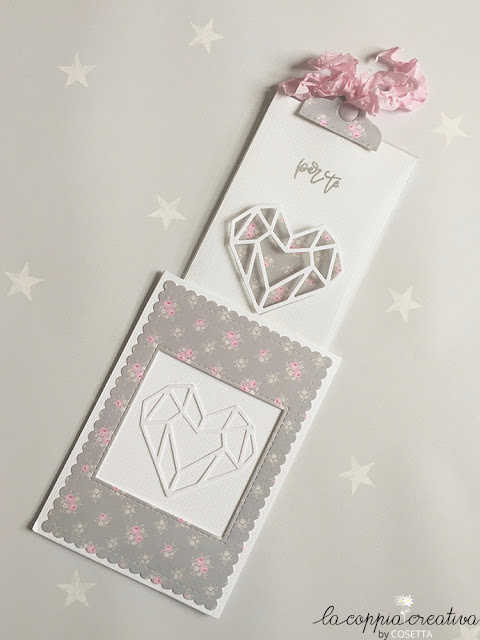 Buongiorno a tutti! Oggi è il mio turno per il posti di “La Coppia Creativa” e vi propongo una “sliding card” con cuore di cristallo. Ormai questo bellissimo cuore l’avrete già visto nei miei lavori, ma è troppo bello e lo trovo davvero adatto a tanti tanti progetti… La card che vi propongo è una “Sliding Card” ovvero una card scorrevole… nel senso che la tag interna scorrendo verso l’alto e, come per magia, mostra un cuore fiorelloso…